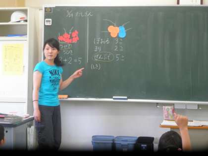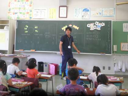 明日の運動会に向けて、通し練習を終えた後、1年生は、算数の学習です。足し算の学習です。黒板の掲示もかわいらしくて、進んで学習したくなります。
