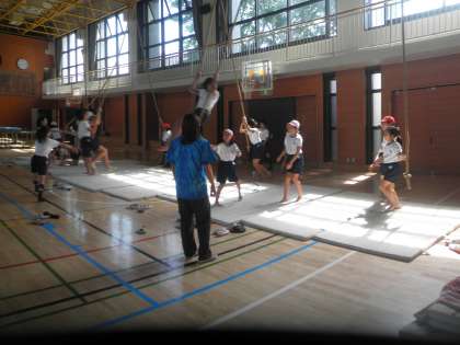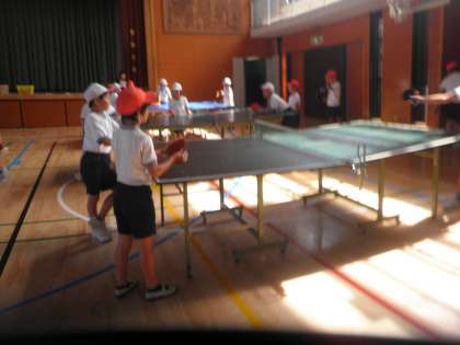 運動会が終わって、久しぶりのクラブ活動です。まずは、体育館でやっている卓球クラブと体操クラブの様子です。みんな楽しそうに取り組んでいます。