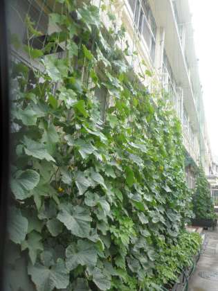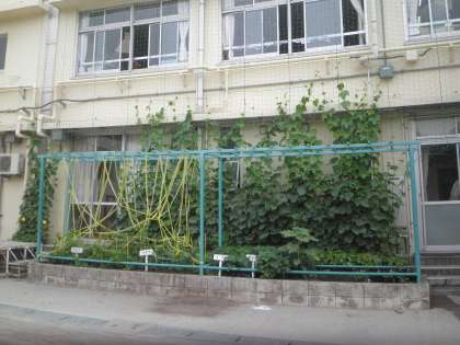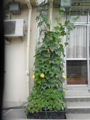 4月に植えたグリーンカーテンがだいぶ大きくなってきました。そろそろ花も咲いて、丈も大きくなってきました。緑もうっそうと茂ってきています。