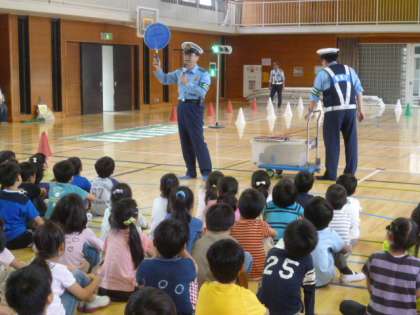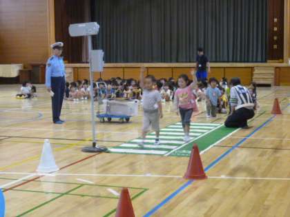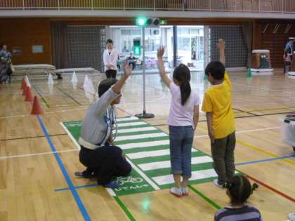横断歩道の渡り方や道路での正しい歩き方について、成城警察署の方からお話を聞き、体育館内につくられた横断歩道や道路での歩行体験をしました。左右の安全確認や右側歩行のしかたについてしっかりと学習することができました。