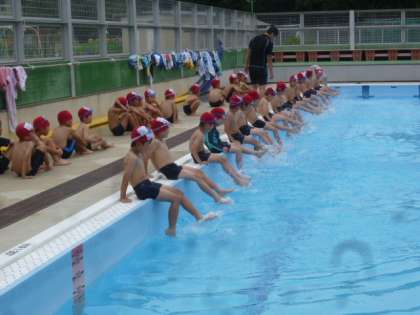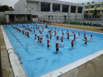 1年生は、3・4校時に初めて小学校のプールに入りました。