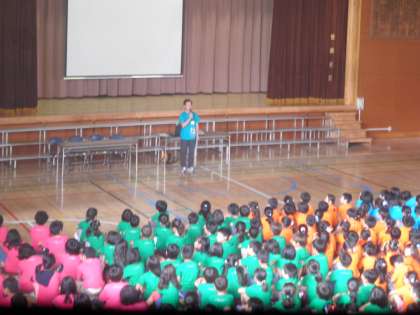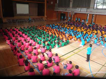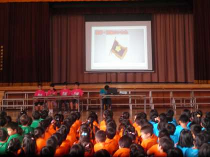 今日は開校記念集会でした。みんな開校記念Tシャツを着て集会に参加しました。校長先生のお話の後、代表委員会が烏山小学校の歴史について説明してくれました。その後、100周年に参加した卒業生の吉岡さん、110周年に参加した佐藤さんに昔の烏山小学校の話を伺いました。