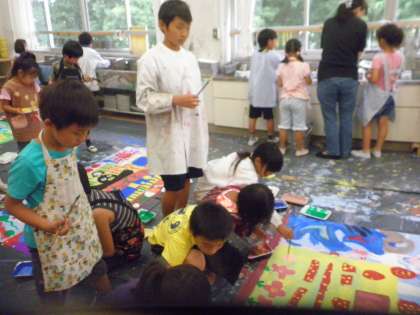 今日は仕上げの日です。今年のテーマは「140周年」なので、みんな明るい色を使って楽しい絵を仕上げています。中学生のお手伝いボランティアの生徒さんたちもよく働いてくれました。