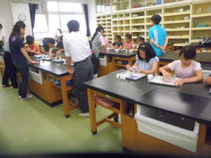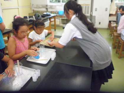 理科実験教室は、スライム作りです。今日も上祖師谷中学校のボランティアの生徒さんが手伝ってくれました。きれいな色のスライムができました。