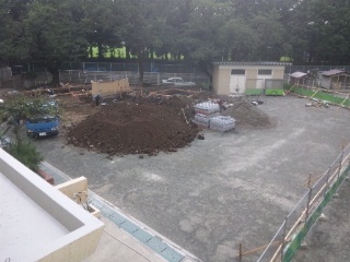校庭では、固定遊具の改修工事を行っています。現在、基礎工事が進んでいます。登り棒、うんてい、ジャンルジム、造形活動用の砂場を新しく設置します。2学期が楽しみです。