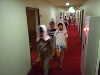 開園式のあと、荷物を持ってそれぞれの部屋に入りました。早速、非常放送の指示に従って、避難訓練をしました。防災頭巾を着用し、非常口と避難経路を確認しました。