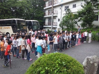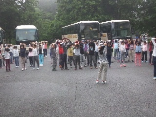 おはようございます。2日目の朝を元気に迎えました。曇り空ですが、ハイキングへ向けて準備をしています。宿舎前で朝の会を行いました。