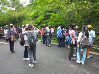 竜頭の滝を見ながら、上流へ向けてハイキングがスタート。天候も少しずつよい方向に向かっています。