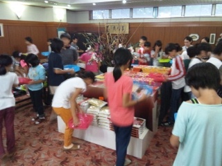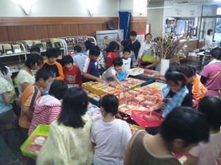 入浴のグループと交代で、宿舎方々が準備してくださったおみやげコーナーで、おみやげタイムを楽しんでいます。予算内で値段と相手を考えながら、真剣な表情で買い物をしています。