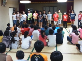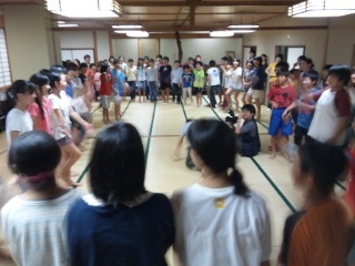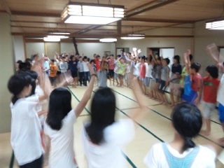 夕食後の大広間。室内レクリエーションの会場に早変わり。レク係が中心となって、間違い探し、リーダー探し、だるまさんが転んだ、どんジャンケン、4つのゲームを楽しみました。最後に真っ暗になった部屋に特別ゲストが登場。怖い話!最高の盛り上がり。心に残るひとときをなりました。
