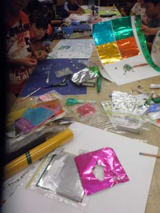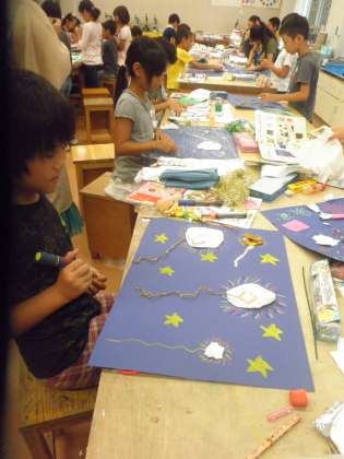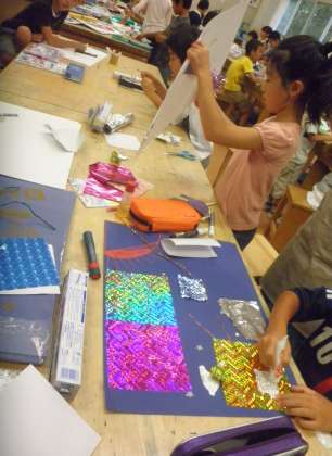 3年生の図工の授業を見ました。「ようこそ キラキラの世界へ」の学習で、きらきら光る素材を使って世界を作る学習です。きらきらした素材を使って楽しく作業をしていました。