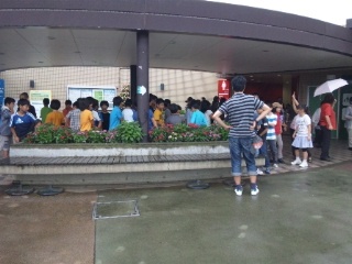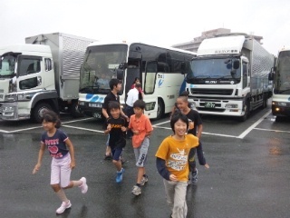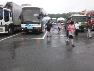 関越自動車道の三芳パーキングエリアで休憩をとりました。小雨が降っていますが、みんな元気です。バスレクを楽しみながら、川場へ向かっています。