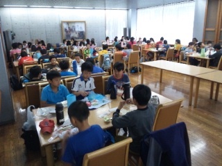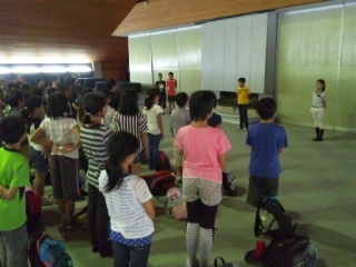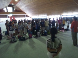 予定通り宿舎のふじやまビレジに着きました。雨が降っているため、村の会堂で開室式を行いました。また、食堂でお弁当を食べました。いよいよ川場での生活の始まりです。