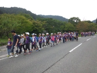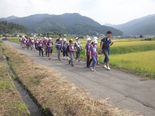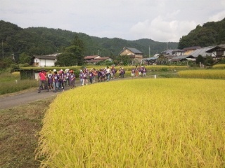 村めぐり中です。一面に広がる田園風景の中を散策をしています。彼岸花やコスモスも美しい姿を見せています。