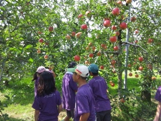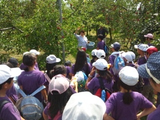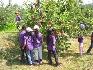 いよいよ、りんごもぎ体験です。りんご園の方から、もぎ方、りんごの選び方を教えていただきました。おいしいりんごを求めて行動中です。