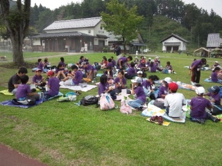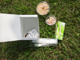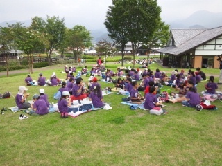 村めぐりを終え、予定よりやや早く田園プラザに着きました。芝生広場でお弁当を食べています。五目ご飯、チキンオーブン焼き、10種サラダ、野菜ジュースです。