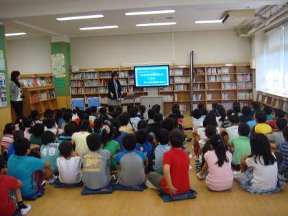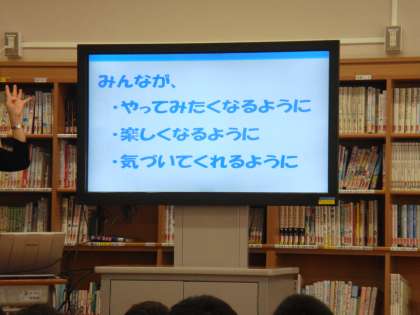 夏休み前から節水の勉強を始め、ご家庭でも節水への取り組みにご協力いただいております。10月のキッズフェスティバルで節水PRとしてシールを作成します。シールは花王の方の協賛により作っていただけます。それに向けて、今日は花王の方からポイントを教えていただきました。「『短い言葉で、印象にのこり、心にとどく』メッセージを考えるといいですよ」とCM映像やお店の陳列での工夫を通して学びました。これから、節水が広まるようなシールの作成を考えていきます。