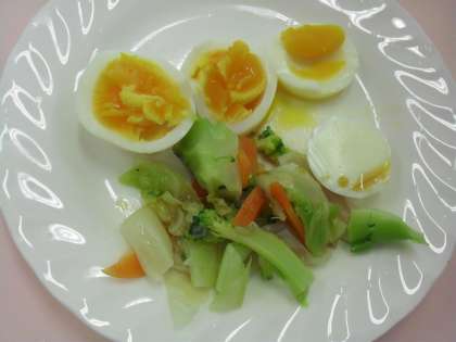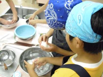 協力して、ゆで野菜やゆで卵を作りました。ゆで卵は4分、8分、12分と時間を変えて、食べ比べました。時間によって黄身や白身の様子が変わることが分かりました。