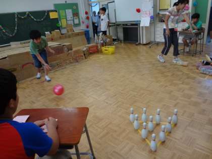 つくし学級は、迷路とボーリングをしました。ボーリングのピンは子どもたちがみんなでペットボトルに色を塗りました。楽しいゲームでたくさんの子どもが参加していました。