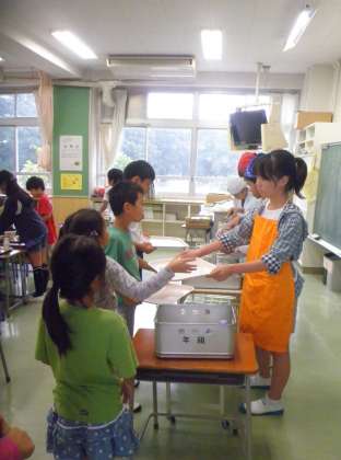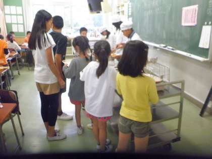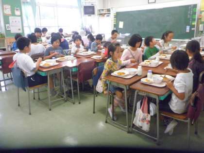 今日は、交流給食です。それぞれの縦割り班の教室に行って、給食の準備から始めます。6年生を中心にみんなで協力して給食を用意して、みんなで仲良く給食を食べます。