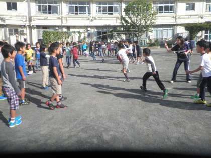 今日は、長縄を使った「なわとび集会」でした。それぞれの学級で「なわとび旬間」に練習した成果を発揮し、5分間で何回跳べるかに挑戦しています。どの学級もみんなで力を合わせて楽しく一生懸命に跳んでいました。