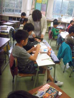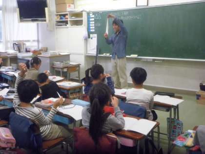 3年生の算数の学習を見ました。少人数クラスで三角形の学習をしていました。実際に三角形を折ったり、重ねたりして三角形の性質を見つけていました。みんな三角形についてわかったことをたくさん発表していました。