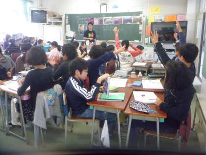 5年生は、理科「流れる水のはたらき」の学習です。自分の考えをみんな手を挙げて、しっかり発言しています。
