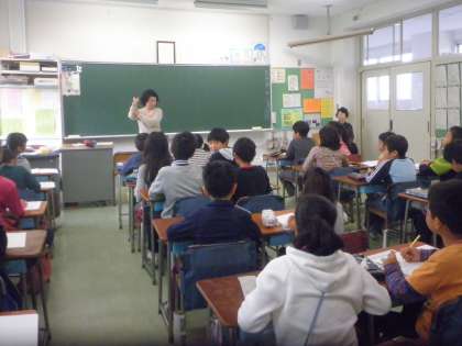 4年生の福祉の学習で、「さっちゃんのまほうのて」の作者 野辺 明子さんとその娘さんの長塚 麻衣子さんがお話を聞いています。