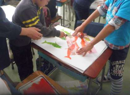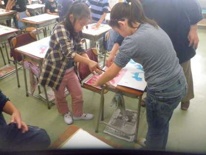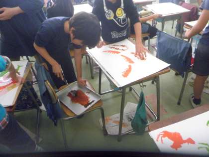 2年生の図工の学習です。プラスチックの板で作った型にローラーで色をつけて版を作っています。同じ型を色を変えたり、場所を変えて、工夫した図柄を作っています。友達と協力して、真剣に取り組んでいます。