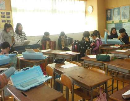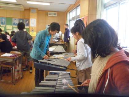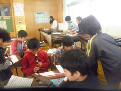 6年生の音楽の学習です。合奏の練習を学期のパートごとにグループになって練習しています。みんな声を掛け合って自主的に練習しています。