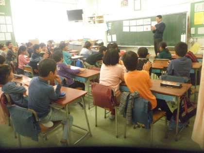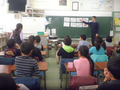 今日は、台所で使うものを英語で言って覚えています。どの子どもも発音が良くてびっくりです。みんなALTの先生と楽しく学習に取り組んでいます。