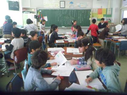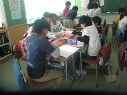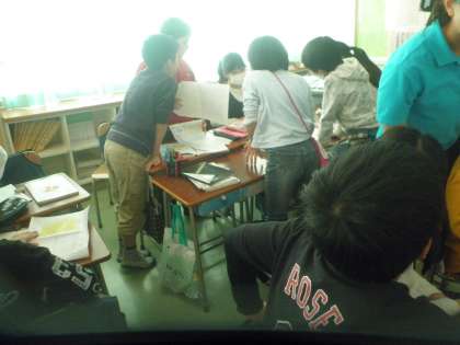 4年生の国語の学習を見ました。みんなが書いた新聞の良いところを班ごとに話し合っています。みんな真剣でまた、和やかに話し合いが進んでいて、みんながそれぞれの新聞の良さをしっかり話し合っている様子が伺えました。