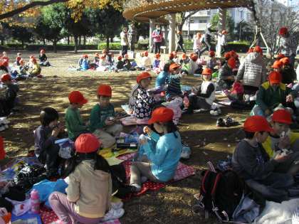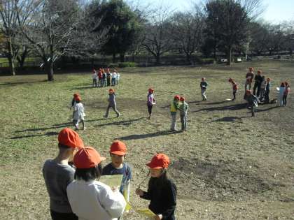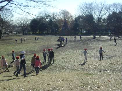 1年生と2年生が一緒になって、公園にあるたくさんの自然を見つけました。その後は、おにぎりを一緒に食べ、公園をかけまわって、いろんな遊びをしました。天気も良く、広い公園で元気いっぱいに過ごすことができました。