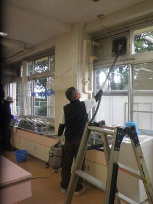 年末ということで、主事さんもいろいろな場所の大掃除に取り組んでいます。家庭科室の換気扇や流しを丁寧にお掃除しています。学校がいつもきれいなのは、主事さんのおかげです。