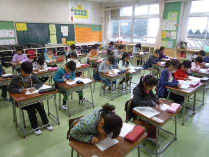 冬休みに練習をした硬筆での書き初めを、来週からの書き初め展へ向けて清書しています。ちょっぴり緊張しながらも、お手本を見ながら一字一字丁寧に、気持ちを込めて書いています。初めて書いた2学期の文字よりもとても上達した1年生。14日(火)から開催する「書き初め展」をお楽しみに。