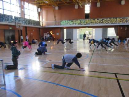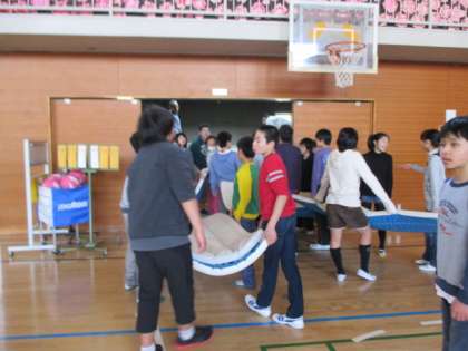 6年生が、掃除の時間に展覧会の会場準備をしています。マットや跳び箱を片付けたり、ひな段を組み立てたり、終わった子どもたちは、体育館の床を拭いています。みんな一生懸命に動いていて気持ちがいいです。