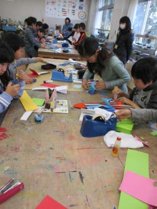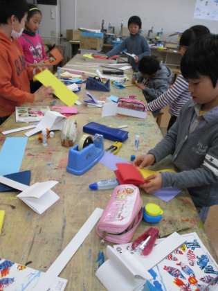 3年生が紙工作作りをしています。工夫して紙が飛び出すなど、動く仕組みを作っています。みんな楽しそうに取り組んでいます。