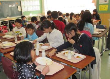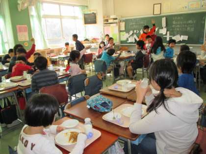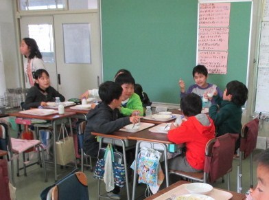 給食の準備ができると、みんなで給食を食べます。いろいろな学年の人たちと楽しく話しながら食事をしました。