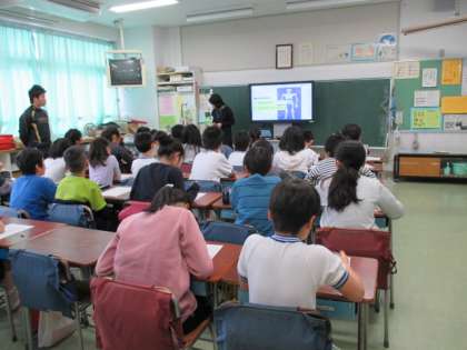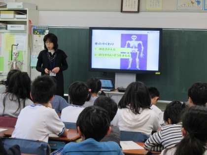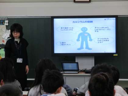 4年生が、食品会社の出前授業で食育の学習をしています。骨の働きと食べ物の関係について学んでいます。