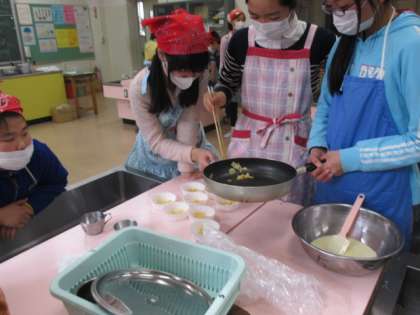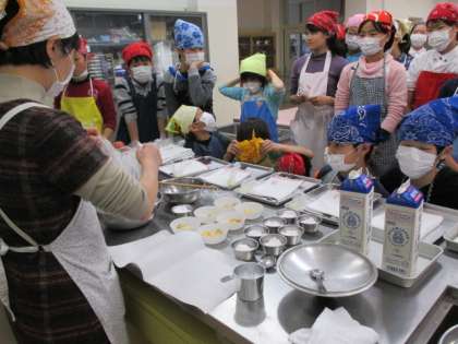 6年生が、調理実習で「りんごの蒸しパン」を作っています。作り方の説明を聞いて、グループで協力して作っています。