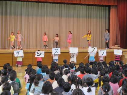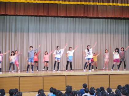 今朝は、体操クラブ、ハンド・ドッジボールクラブ、ダンスクラブの発表でした。それぞれのクラブの活動の様子や活動の成果を発表していました。
