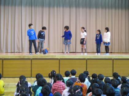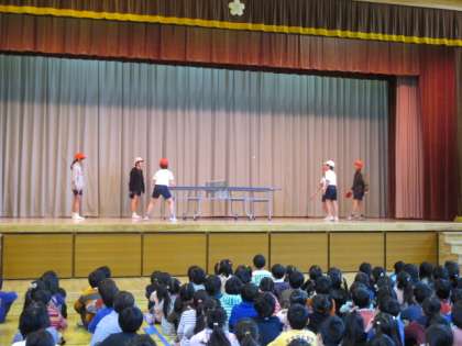 今朝のクラブ発表は、卓球クラブ、ゲーム遊びクラブです。卓球クラブはラリーの様子を見せてくれました。