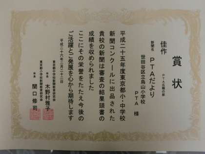 PTA広報委員会が作成した広報誌「PTAだより」が、平成25年度東京都小・中学校新聞コンクールPTA広報の部で、佳作を受賞しました。