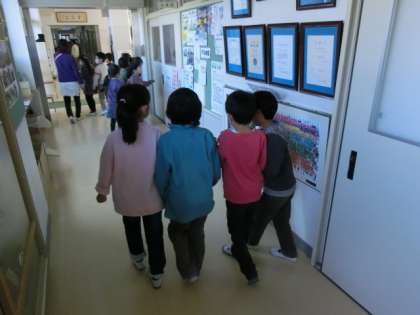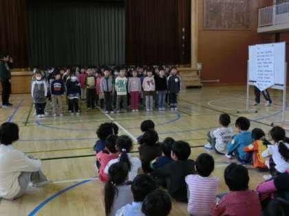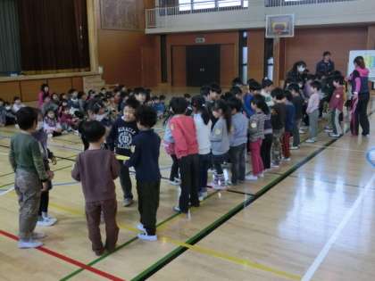体育館に集合し、まず学校探検を行いました。職員室・校長室・主事室・保健室そして1年生の教室をグループごとに手をつないで探検しました。その後、体育館に戻り、ハンカチ落とし・花いちもんめ・クイズ・じゃんけん列車などの遊びを楽しみました。最後に、1年生が合唱を披露し、プレゼントを渡しました。