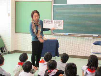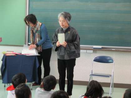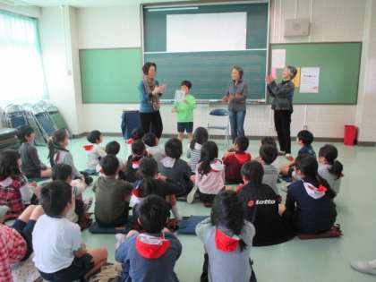 3年生のおはなし泉の会の読み聞かせの様子です。読み聞かせだけでなく、ひらがな一音でいろいろな表現をする活動をしていました。「う」「お」などの音を気持ちに合わせて子どもたちが表現していました。とても楽しい取組でした。また、読んだ本の作者や挿絵についての説明もしていただき、楽しい一時間でした。