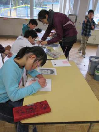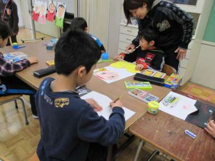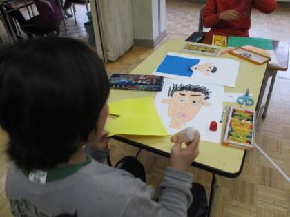 つくし学級の図工の様子です。今日は、自分の顔を描いています。クレパスを使って輪郭や表情を工夫して描いているようです。