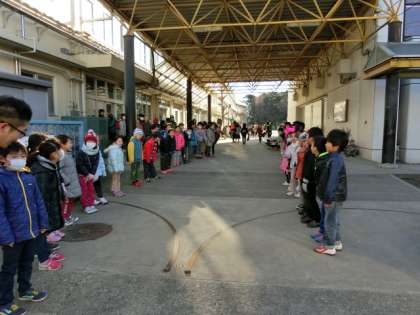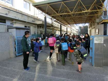 今朝の正門(東門)でのあいさつ隊を担当したのは、もうすぐ2年生に進級する1年生でした。冷たく強い風が吹く中、元気に「おはようございます!」の声をかけ、登校してくる人たちを迎えていました。