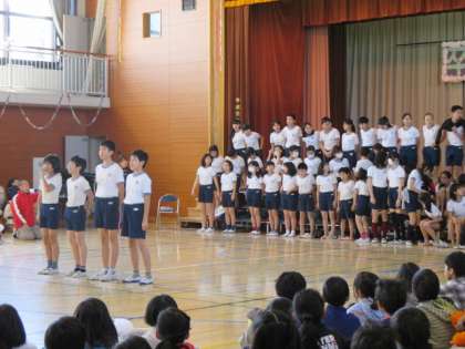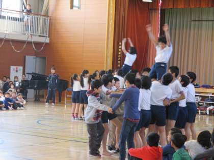 最後に6年生がお礼として、運動会で演じた組み体操の中から「ダイビング」と「バイキング」を見せてくれました。とても上手でした。