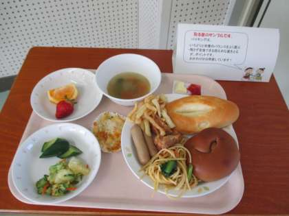 今日は、6年生の卒業記念のバイキング給食でした。主食3種類+ジャム・マーガリン、主菜2種類、汁物1種類、副菜3種類、デザート2種類の中から自分の食べたいものをバランスよくとって食べるというものでした。