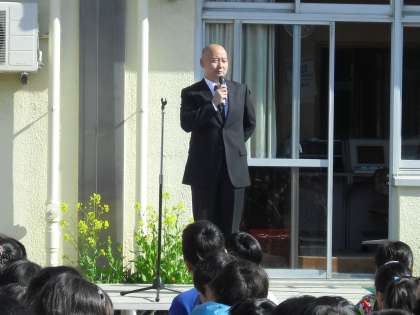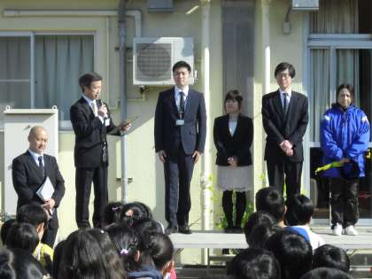 最初に着任式が行われ、新しく烏山小学校に赴任した教職員の紹介がありました。その後、一言ずつあいさつをしていただきました。
